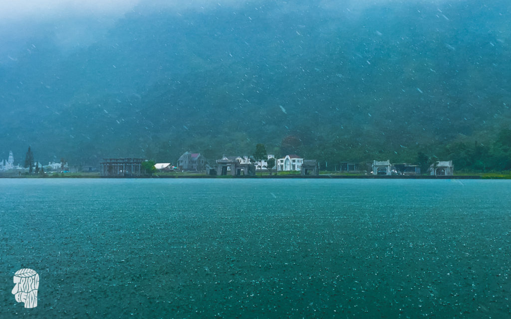 土砂降りの雨の中、湖を一周してもうすぐホテルが見えてくるというところで、霧が晴れ、スコールも止まる。