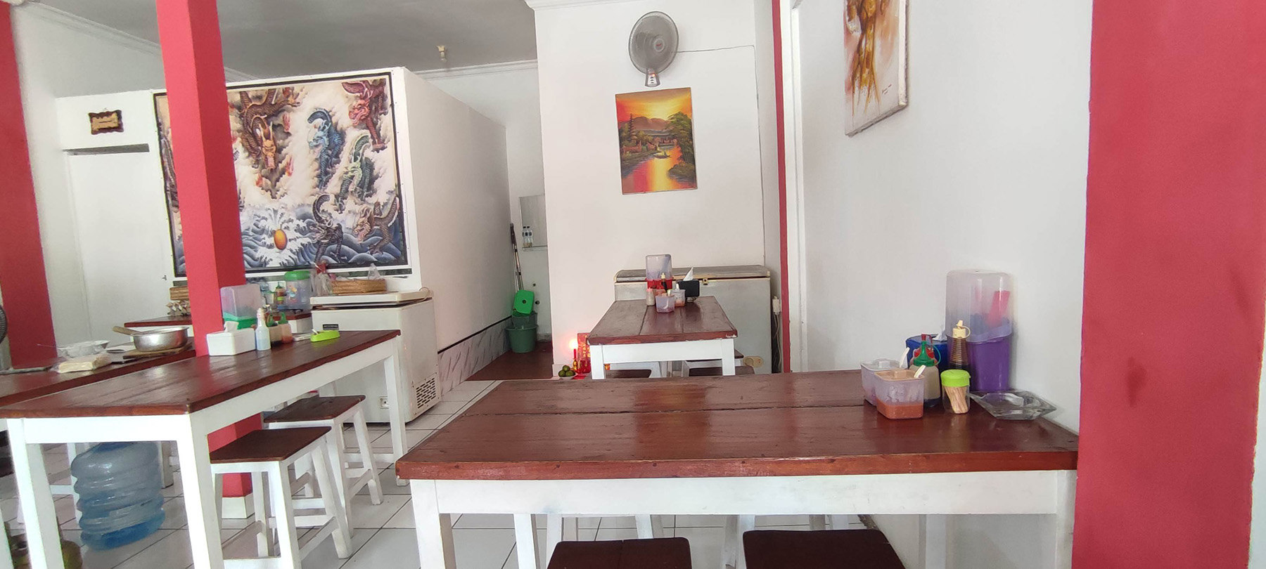 スマトラ島、メダン出身のご夫婦が開いた新しい麺料理のワルン「Mie Pangsit Djoe Djoe Medan」。場所はデンパサール西部、イマム・ボンジョール通り155番地にあります。店内は大きくはありませんが、清潔で整えられた空間は小さくても心地よい雰囲気です。車の駐車スペースは広くありませんが、バイクであれば数台は店前に停められます。中国とバリの文化が混ざったような壁の絵や、入口の赤いランタンが、こぢんまりとした店に温かみを添えています。