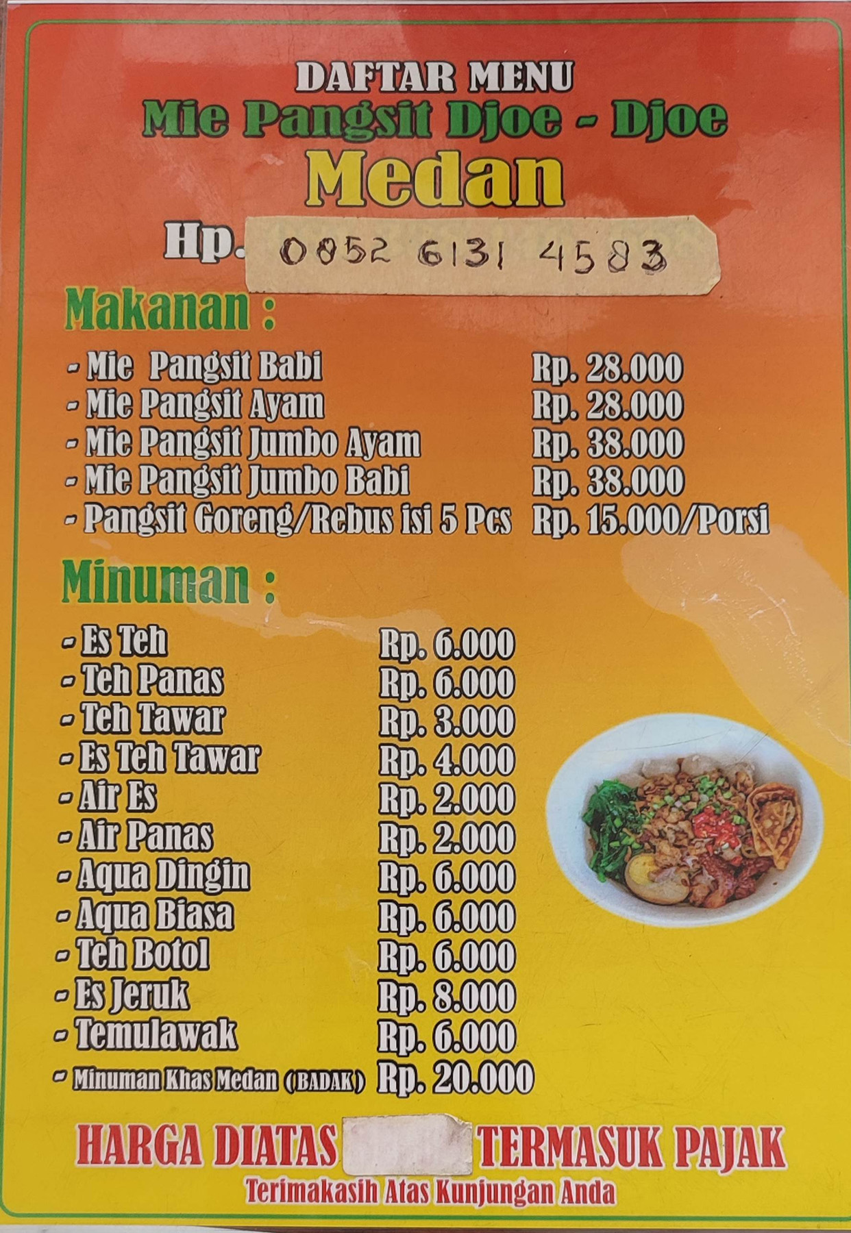 For drinks, the shop offers simple choices like unsweetened tea, mineral water, and fresh orange juice. If you’re craving Medan-style noodles while in Denpasar, this place is definitely worth a visit.