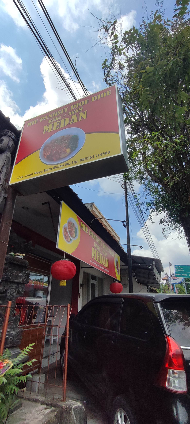 Mie Pangsit Djoe Djoe Medan is a newly opened noodle shop run by a couple originally from Medan. Located in West Denpasar on Jalan Imam Bonjol No. 155, the shop may be small, but it is clean, neatly arranged, and surprisingly cozy. Parking for cars is limited, although several motorbikes can fit in front of the shop. The interior is decorated with a mix of Chinese and Balinese-style paintings, and two red lanterns at the entrance add a warm, inviting touch.