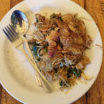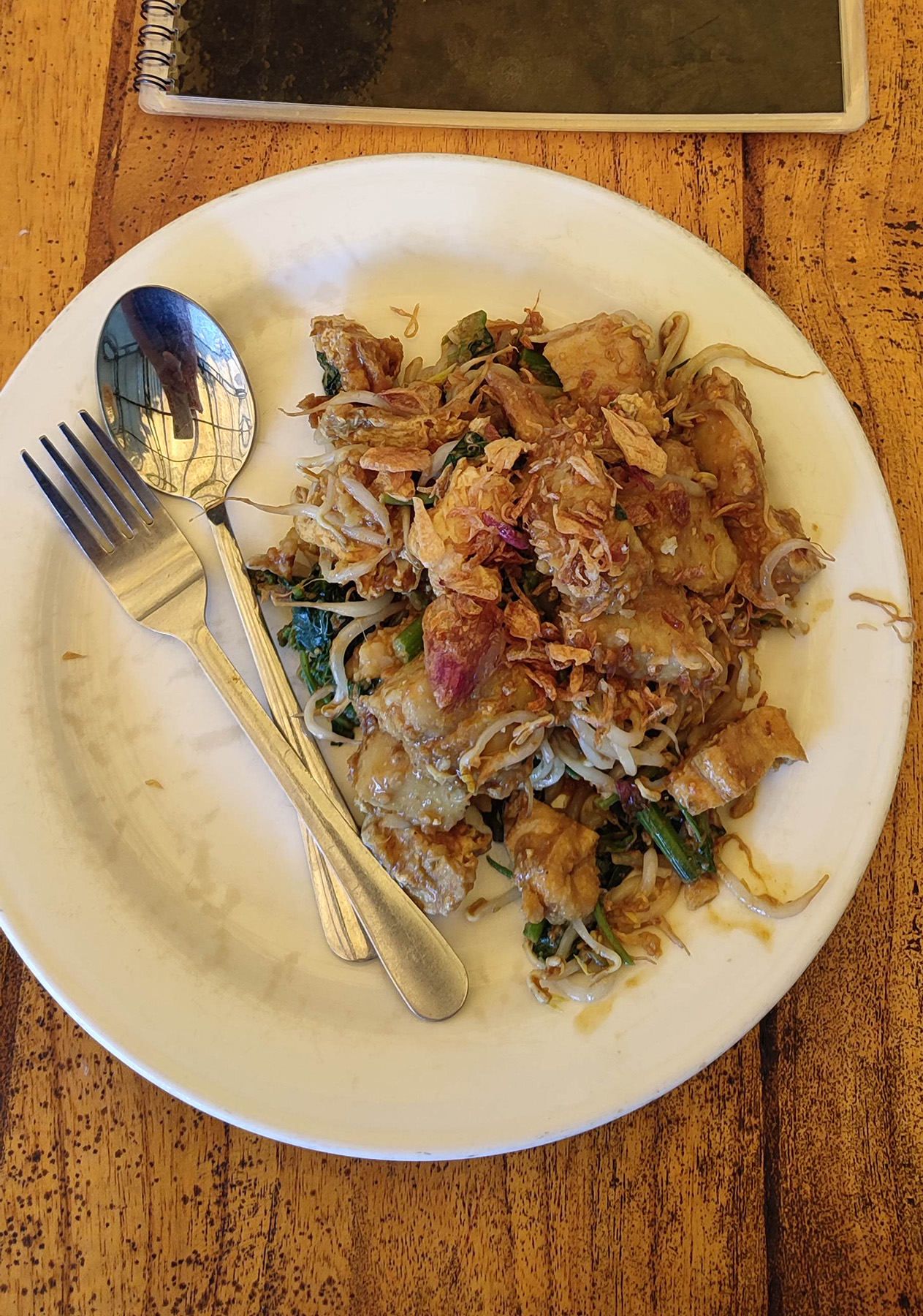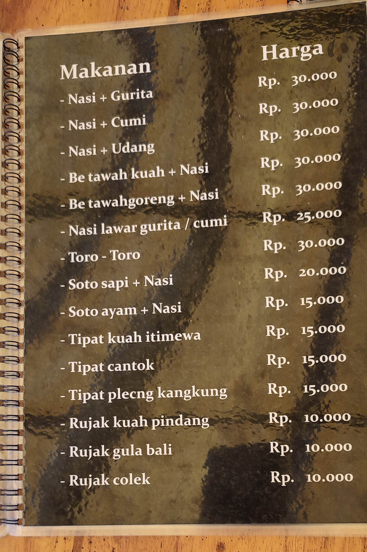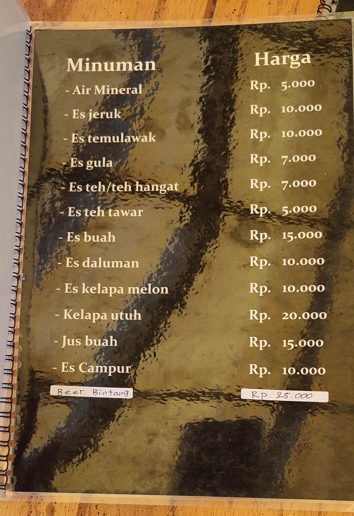 Other menu options include rice with prawns, octopus, or fish, as well as the highly recommended Tipat Cantok, known for its generous portion and rich flavor. A variety of drinks is also available, including whole fresh coconuts.