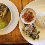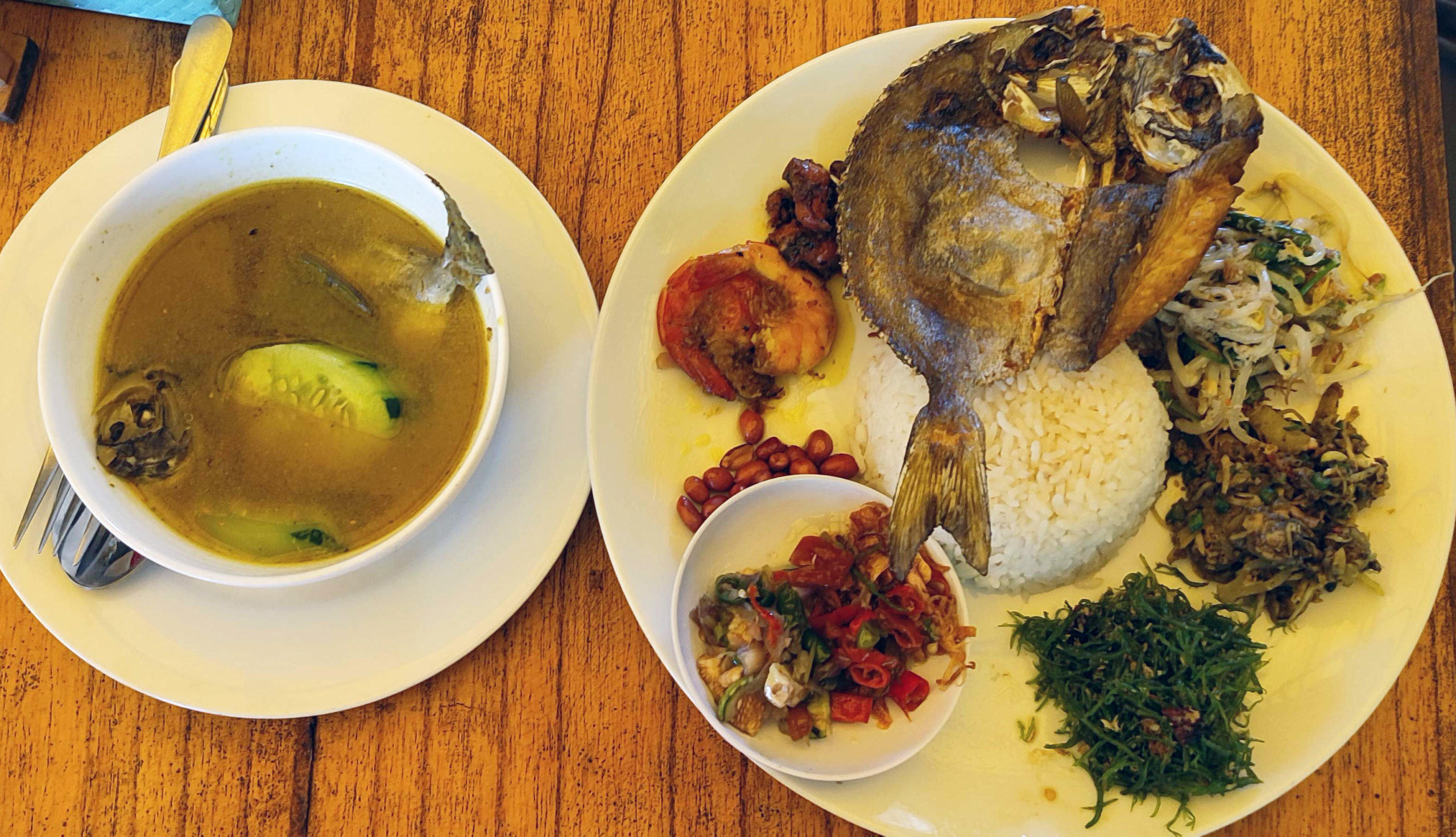 魚は揚げたてでパリッと香ばしく、身はふんわり。魚スープは、バリの代表的なスパイスバセ・グネップを使った香り豊かな味わいです。辛いのが苦手な方は、サンバル抜きも可能です。